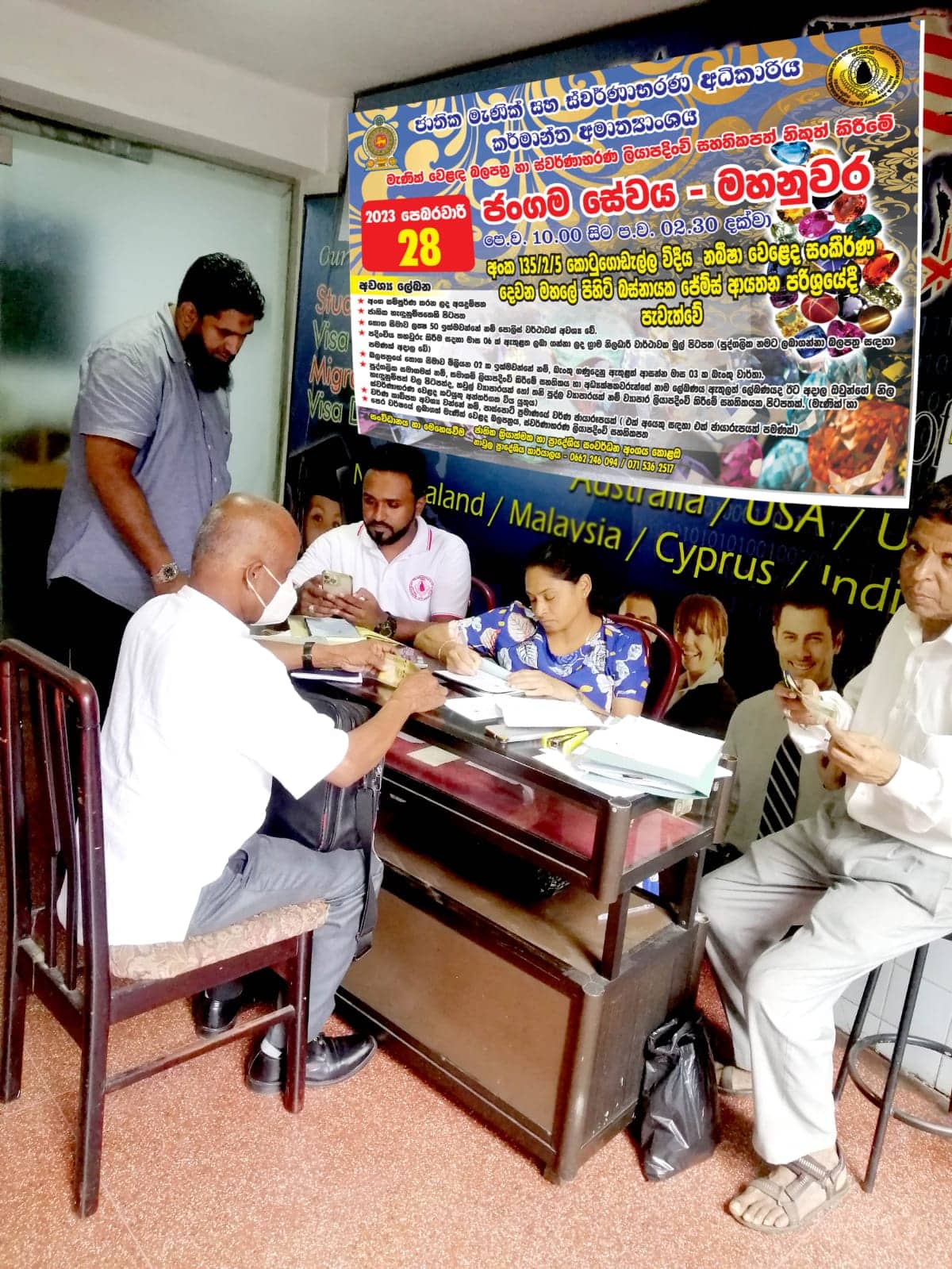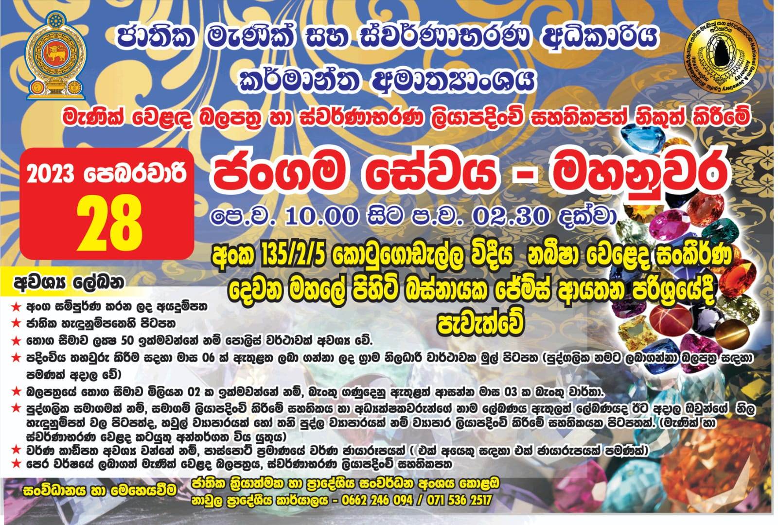 කොළඹ – ක්රියාත්මක හා ප්රාදේශීය සංවර්ධන අංශය හා නාවුල ප්රාදේශීය කාර්යාලය එක්ව මධ්යම පළාතේ තෝරාගත් නගර කේන්ද්ර කරගෙන 2023.02.28 දින (කොටුගොඩැල්ල විදීය , රජ වීදිය , D.S. සේනානායක වීදිය , දිගන , කටුගස්තොට , අකුරණ ) ස්වර්ණාභරණ වෙළදසැල් ලියාපදිංචි කටයුතු , මැණික් වෙළෙඳ ස්ථානයන් ට අදාල බලපත්ර ලබාදීම හා මහනුවර නගරය කේන්ද්ර කරගෙන නබිෂා වෙළෙඳ සංකීර්ණයේ බස්නායක ජෙම්ස් ආයතන පරිශ්රයේදී එක්දින ජංගම සේවාවක් ද පවත්වන ලදි.